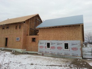 Recently we’ve started making our Larsen Truss (LT) assembly. These are the vertical structures that suspend the surface of the exterior wall further out from the structural wall in order to accommodate a thicker layer of insulation. In our case we’re using 16” I-joists that are lag-bolted into the 2”x6” studs. Recall that our OSB sheathing is both our air-tight barrier and vapour barrier, making the LT a completely exterior layer. This is why we affectionately call the LT “the parka”. With its 16” of dense-packed cellulose, it will provide a very effective thermal barrier behind which we’ll be able to work through the winter in relative comfort.